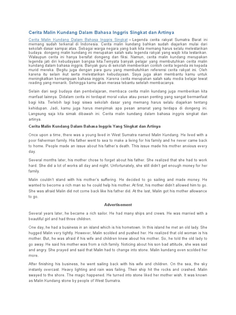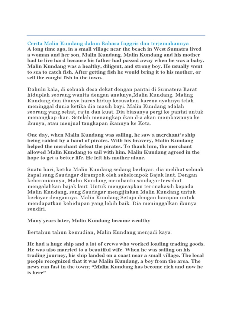 Cerita singkat malin kundang dalam bahasa inggris dan terjemahannya. When he grew older, he felt sorry to see his mother worked hard for his family. Hikmah lain dari cerita malin kundang dalam bahasa inggris yang dikenal sebagai anak durhaka adalah janga sombong dengan kesuksesan atau kekayaan karena tidak akan. Tak disangka kapal mereka bersandar ke pantai di mana dulu malin kundang tinggal. Malin kundang ini konon batunya ada di sumatera barat.